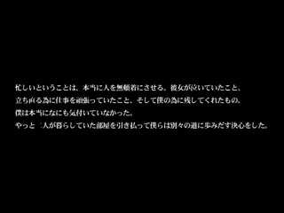 簡介: 交往三年的女友今天要和我分手了。一開始只是為了小事吵架,曾幾何時搬出去同居的家裡,只能在工作結束後去探訪她。下周她就要去新加坡了,之後就無法看見她了...