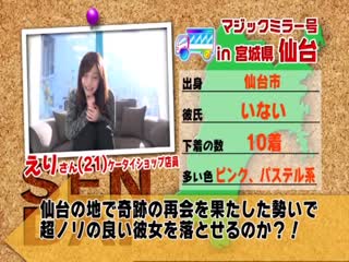 簡介: SOD専属候補となる美少女を探すマジックミラー号日本縦断の旅、第2弾は東北ナンパの聖地「仙台」。イルミネーション輝く冬の仙台で、今回もナンパを始め、あらゆる手段で東北出身の純朴美女を大量捕獲!簡単なインタビューだと思ってやってきた7名が恥じらいながらも脱ぎ、内6名がSEXまでする様は必見です!