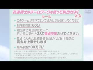 簡介: 叫住街頭女大學生2人組,帶到魔鏡號後,讓他們挑戰逃脫遊戲!在限制時間內幫初次見面的處男開苞破處就能成功逃離,還有高額獎金!疑惑的兩位女大生在處男的拜託下使出渾身解數…